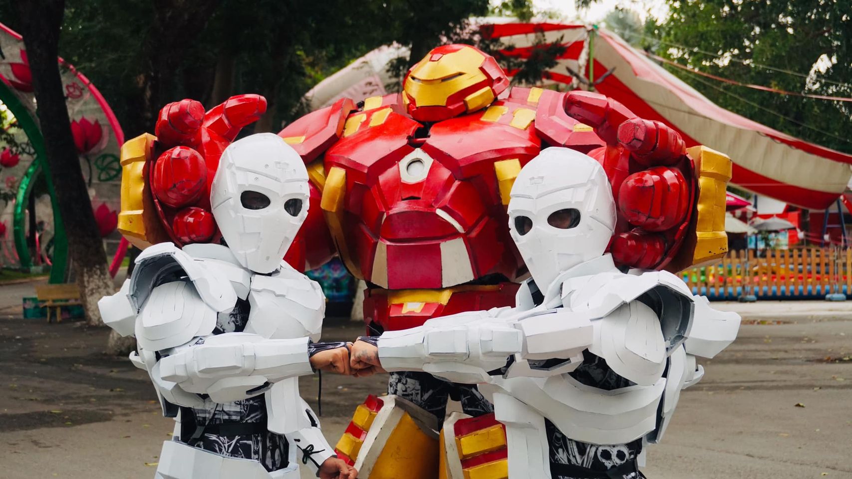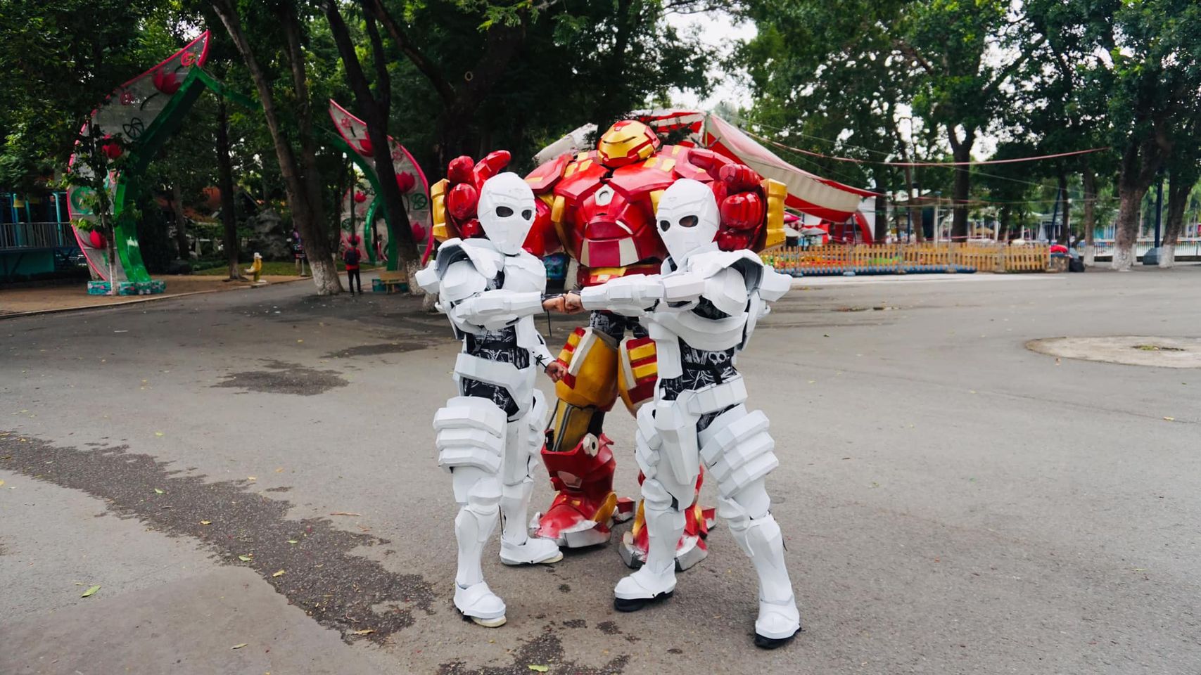 Người mặc bên trong mang cà kheo giúp robot có thể di chuyển linh hoạt và tương tác với khách hàng